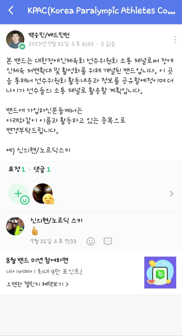 대한장애인체육회 선수위원회 밴드 개설 및 가입 안내