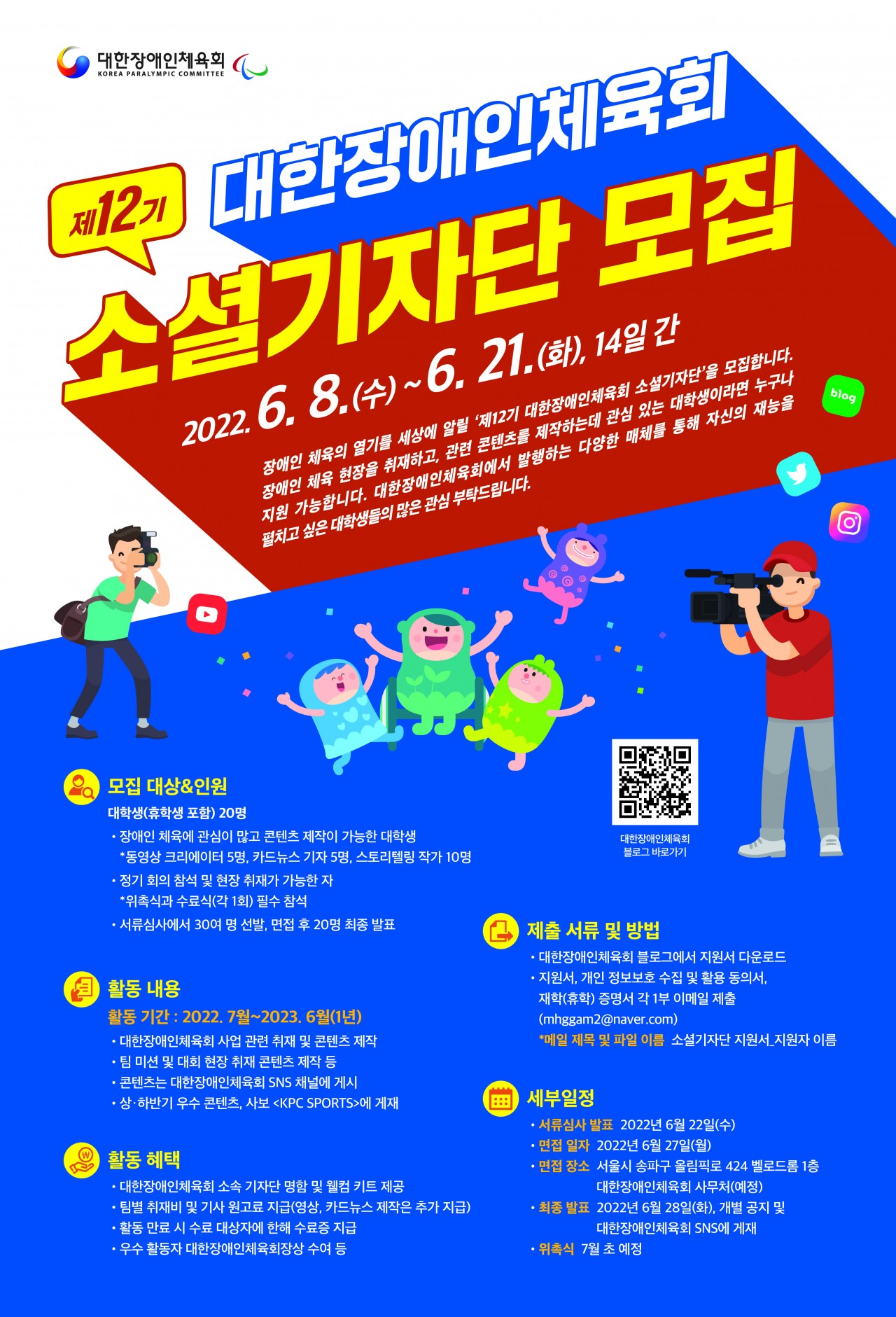 대한장애인체육회에는 장애인체육 홍보 활성화를 위해 '제12기 대한장애인체육회 소셜기자단'을 운영하고자 합니다.