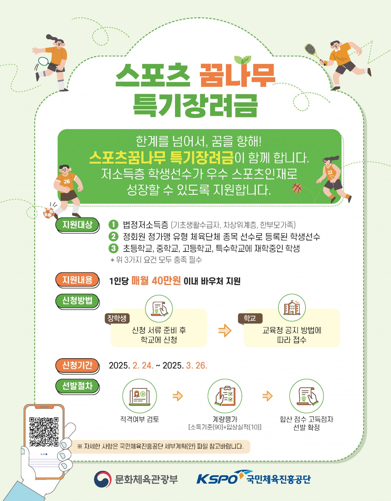 2. 상기 호와 관련하여 경제적 어려움에 있는 우수 학생선수 조기 육성을 위한 '2025년도 스포츠꿈나무 특기장려금 사업'을 아래와 같이 안내드립니다.